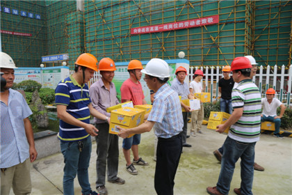 7月23日上午,市總工會(huì)黨組副書記王則康率權(quán)保部長(zhǎng)王錫榮、副部長(zhǎng)孫曉嵐副部長(zhǎng)等市總慰問組,在局工會(huì)副主任盧美月、市城投集團(tuán)公司工會(huì)主席沈俊、副總經(jīng)理周紅衛(wèi)的陪同下,來到金田家園送清涼,慰問一線民工,王書記一行將40箱飲料一一送到民工手中,送去清涼的同時(shí)向大家的不辭辛苦、默默奉獻(xiàn)表示了感謝,并提醒他們一定要適當(dāng)調(diào)整、注意休息。